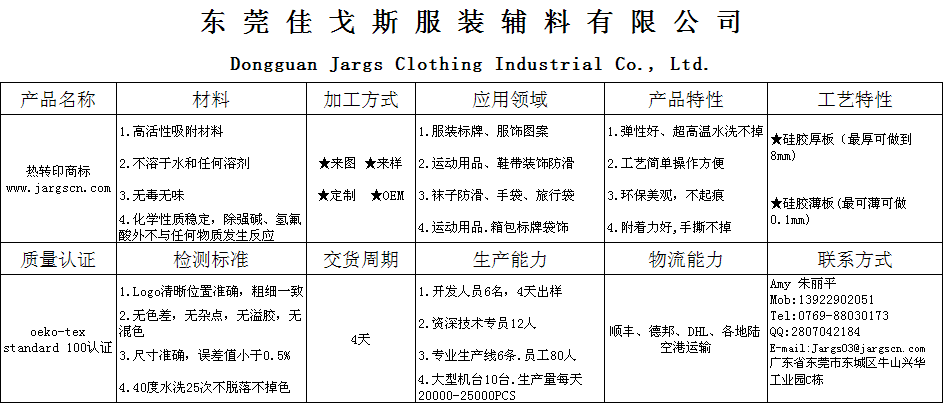 东莞市佳戈斯服饰实业有限公司是硅胶热转印3D标牌、硅胶标牌、硅胶烫画、硅胶丝印薄版厚板、硅胶烫压标牌、内衣滴硅胶涂层、织带滴硅涂层、手套、手袋印花、矽利康标牌、箱包标牌等产品专业生产加工的公司,拥有完整、科学的质量管理体系。东莞市佳戈斯服饰实业有限公司的诚信、实力和产品质量获得业界的认可。欢迎各界朋友莅临参观、指导和业务洽谈。