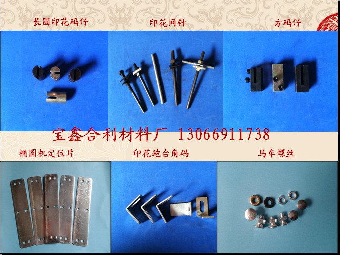 供应产品有:小圆码仔、大小轨道、镀锌导轨、不锈钢轨道、滑触线、导电槽、跑台脚杯、台板角码、T型铁、不锈钢上浆器、方码仔、长圆印花码仔、、铝梅花码仔、塑胶把手、塑胶塞、网针、网钉、马车螺丝、堵头、靠把、椭圆印花机定位片、椭圆机连接板等。