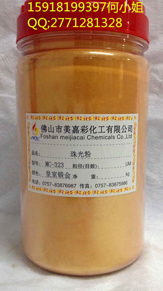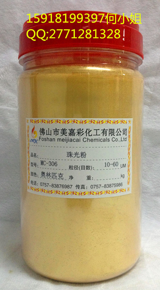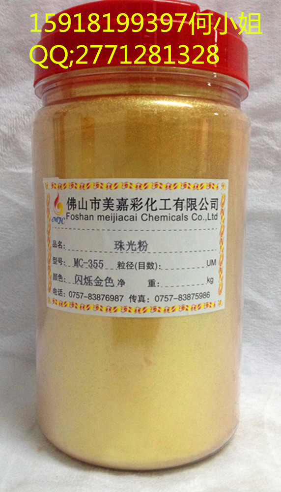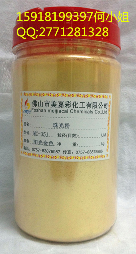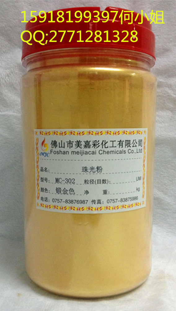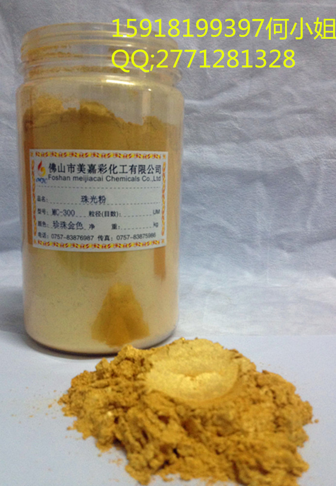 佛山美嘉彩金色珍珠光泽系列效果颜料除涂在云母表面包覆二氧化钛外,还增加了一层氧化铁包覆层,依靠精确控制二氧化钛和氧化铁不同的包覆厚度,产生各种具有较强金属光泽和高饱和度色彩的金色色彩,其色相极好,色谱齐全,在任何场合完全耐高温、耐酸、耐碱、耐化学药品性能、耐光照,可以完全取代金属颜料(如铜金粉等),克服后者易氧化、变色、易燃等缺点。颖彩金色珍珠金属光泽效果颜料色相齐全,可同时相互配色使用,不同的型号和比例相混合或与银白色系列相混合,会得到您所需的理想金色珍珠、金属光泽效果。