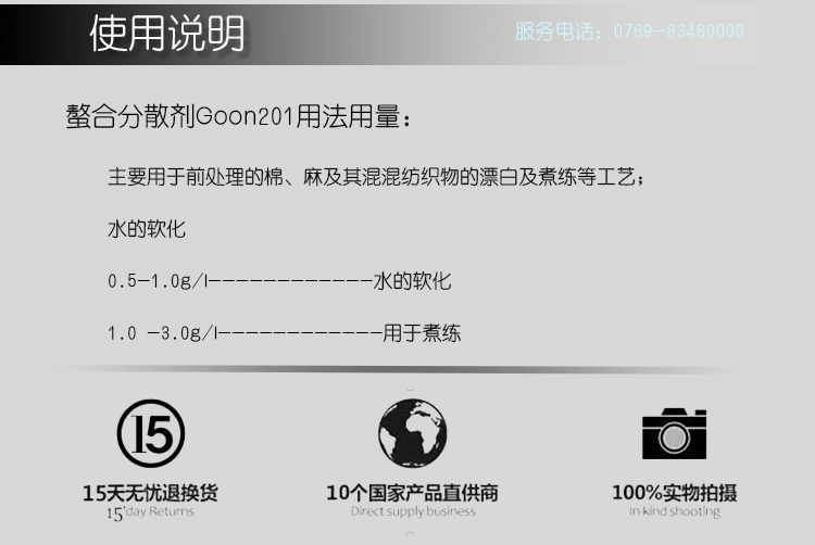 首页 > 产品供应 > 印花材料 > 东莞嘉宏纺织助剂有限公司 > 纺织助剂生产商螯合分散剂Goon201除矽垢环保螯合剂