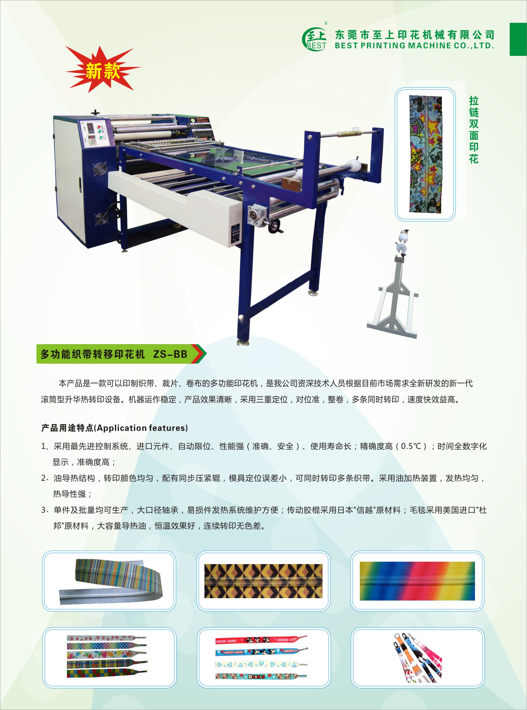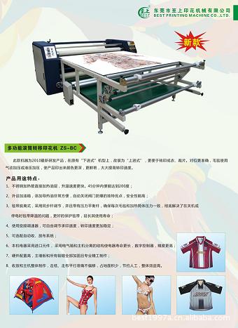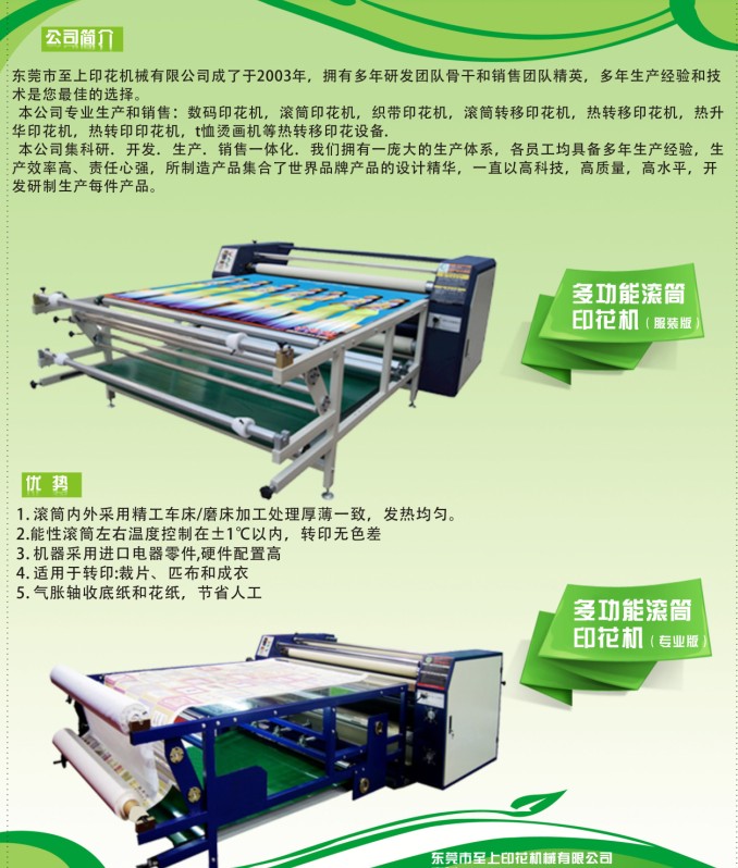 适用范围:本产品适用于大型条幅、旗帜、无纺布、服装布料、毛巾、被单、鼠标垫等产品的升华转印,特别是成匹布料的连续转印。能够连续印花,速度快,满足客户大批量印花的需求。