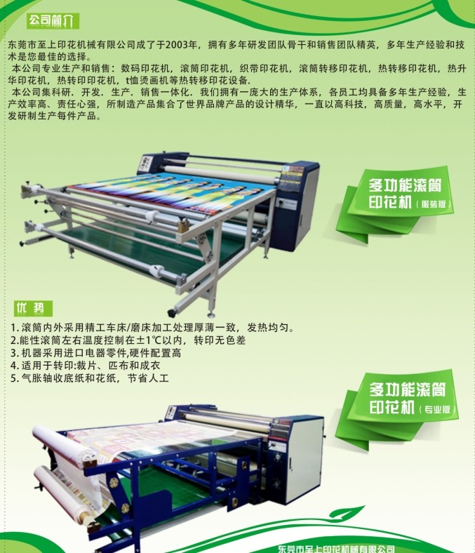至上印花机械公司集科研.开发.生产.销售一体化.公司的印花设备主要针对服装纺织布料,化妆品包装、玩具制造、礼品加工、生活用品、陶瓷金属制品的转移印花。
