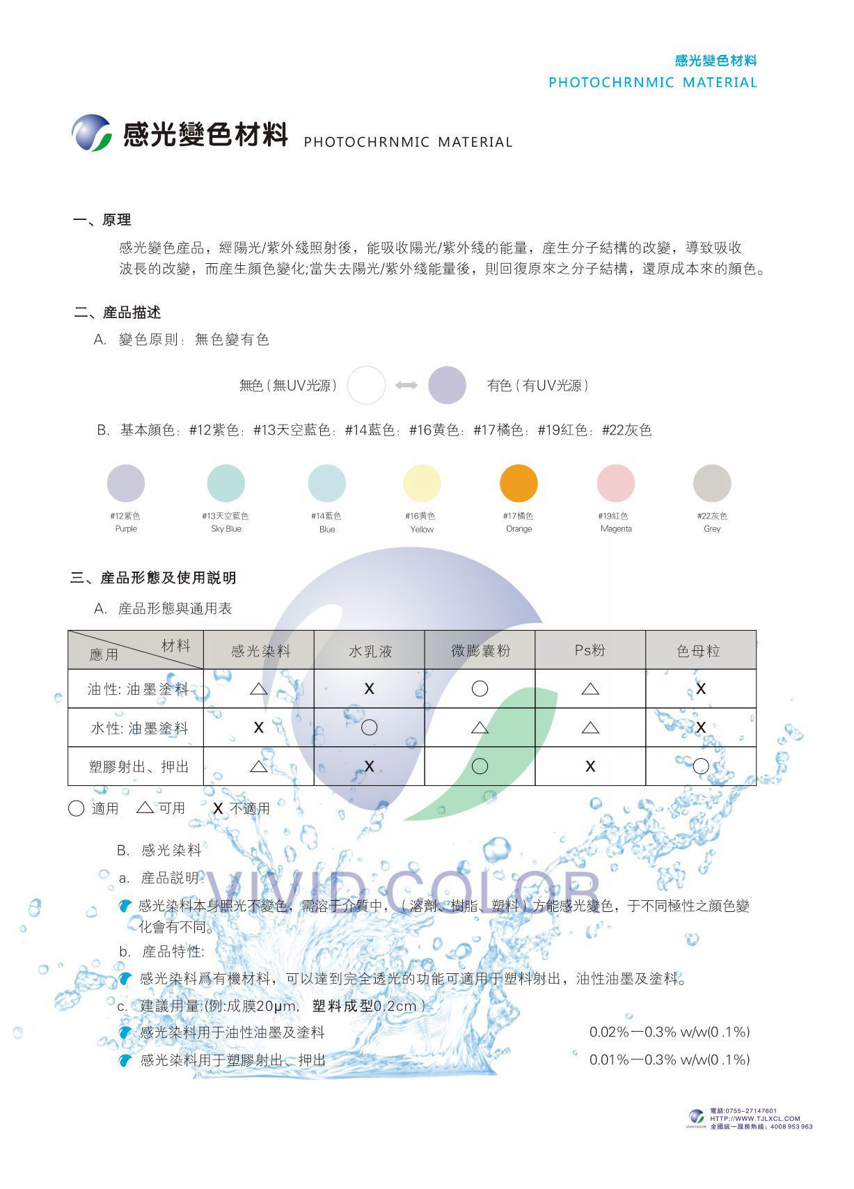 6.感光变色产品的色相会受到使用媒介的极性所影响,例如: 不同的有机溶剂、不同的塑料或树脂等,因此同一感光变色材料在不同的使用媒介环境中经常产生不同的色彩效果。