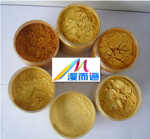 云母铁明亮的金属光泽及青铜色,极好的遮盖力.颜色可分为:青铜缎,红棕缎,葡萄酒红缎,紫红缎,青铜,红棕,葡萄酒红,紫红,咖啡色,闪光青铜,闪光红棕,闪光葡萄酒,闪光紫红等。虹彩珠光粉:金红石型,反射色金黄、红色、紫色、蓝色、红色,透射色淡紫色、淡绿色、黄绿色、淡黄色、淡红色等。明亮、闪光、柔和的珍珠光泽,耐候性好