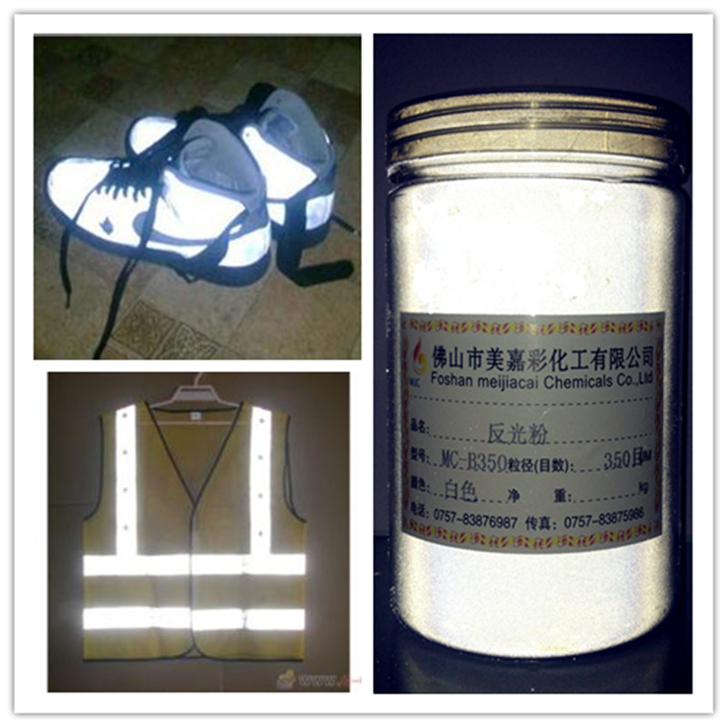 反光粉应用范围:反光粉是生产反光布,反光贴膜、反光油墨、反光标识、广告宣传材料、服饰材料、标准赛场跑道、鞋帽、书包、水陆空救生用品等新型光功能复合材料的核心原材料,它具有回归反光的特性并由此产生较强的回归反射效应,无需外加电源,可广泛用于道路、港口、矿山、消防等领域,作为安全标志,大大地提高了使用者的安全可靠性。广泛应用于丝网印刷、反光漆、反光油墨、交通标志、反光材料等各个领域。