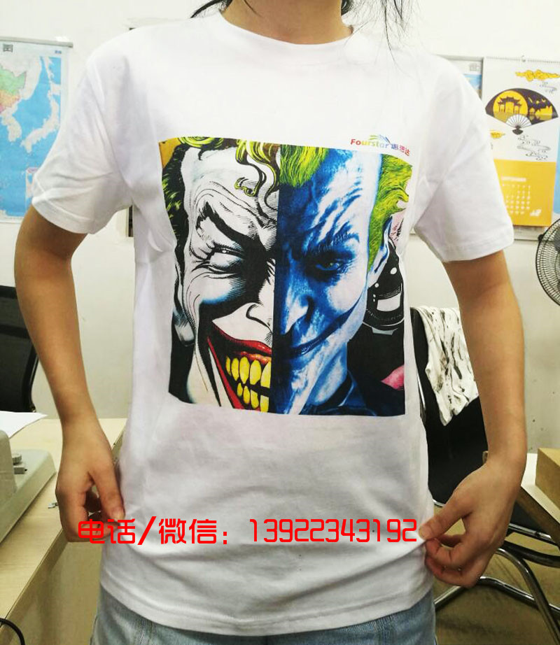 ※T恤等服装上面打印1张A4大小图案只需10秒,满版打印12分钟,真正的批量生产;