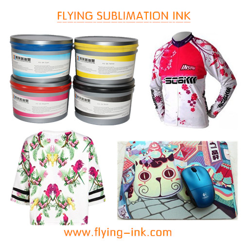 印刷工艺:用胶印机器将升华热转印油墨印在双胶纸(铜版纸)上,印出花纸;然后将花纸和布料一起放在热转印机器内,加热180-220℃,加压,时间15-30S,得出成品(油墨可直接上机使用,不需添加助剂)。