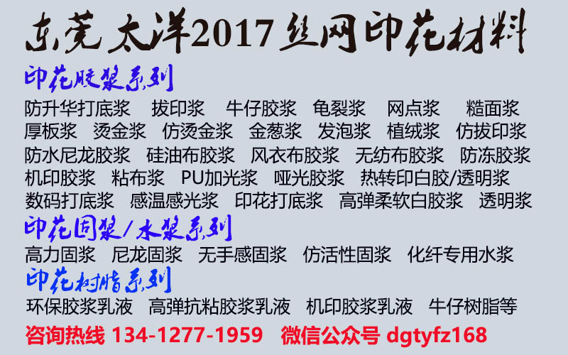 东莞市太洋纺织用品有限公司是一家专业从事于服装丝网印花固浆(水浆)、印花胶浆、印花树脂等水性环保印花材料的研发、生产厂家。产品广泛应用服装/箱包/鞋材等丝网印花工艺中。譬如:针织印花、牛仔印花、无纺布印花、风衣布印花、泳衣布印花、拉浆印花、厚板印花、龟裂印花、网点印花、烫金印花、仿烫金印花、发泡印花、植绒印花、拔染印花、防升华印花、温变印花、光变印花、糙面印花、罩面印花、粘布丝网印、水浆印花等,欢迎广大新老客户朋友前来咨询取样!(134-1277-1959莫S)