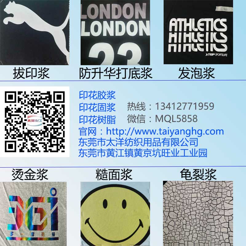 东莞市太洋纺织用品有限公司是一家专业从事于服装丝网印花胶浆、印花固浆、印花树脂等水性环保印花材料的研发、生产厂家。产品广泛应用于服装/箱包/鞋材等丝网印花工艺中,产品具有高弹柔软、高牢度、耐水洗、抗回粘、遮盖强、不塞网、干湿擦在3.5级以上,水性环保等特点,欢迎广大新老客户朋友前来咨询取样!更多产品欢迎关注微信公众号:dgtyfz168.(134-1277-1959 微信:MQL5858 莫S)