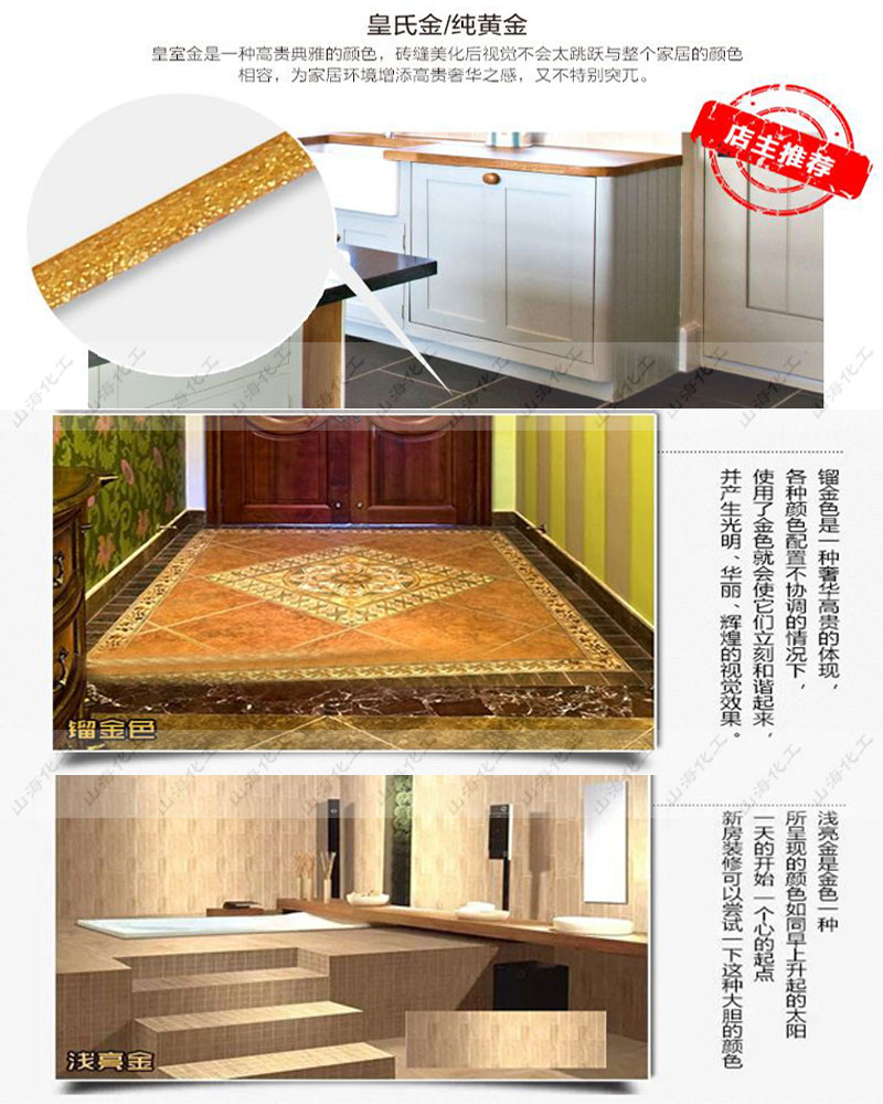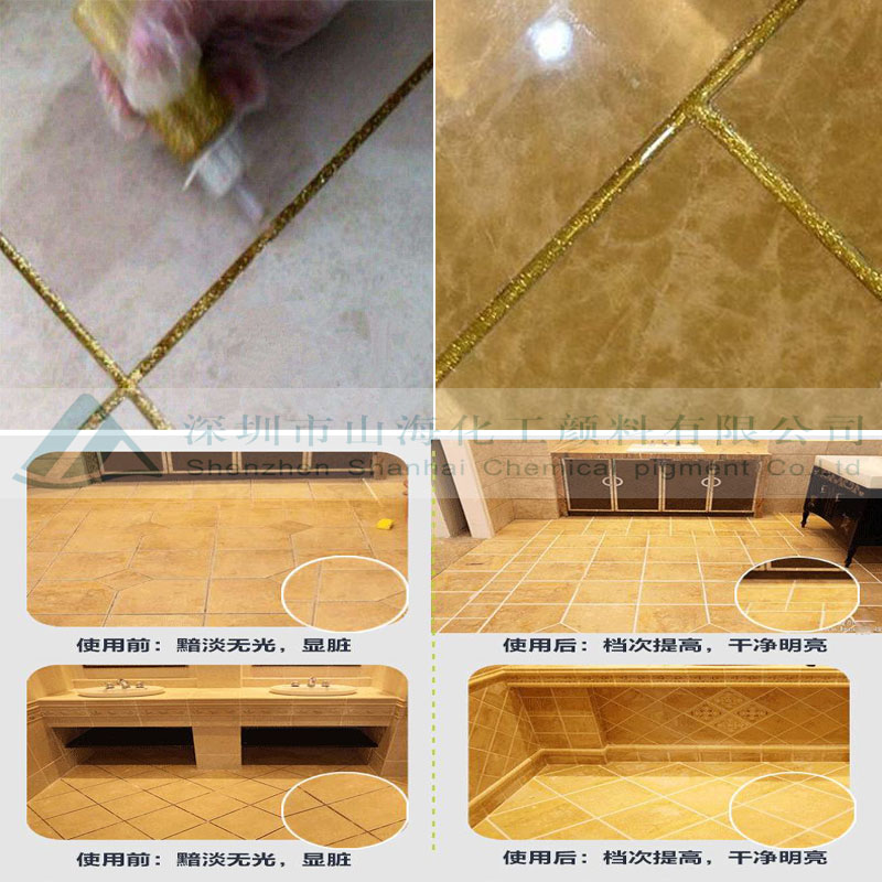 山海化工美缝颜料粉末状有闪亮金、银灰、月光银、咖啡棕、黄金、浅金、镏金、鎏金、象牙金、象牙白、银白、珍珠白、浅亮金、红宝石、亮金色、新象牙金、玫瑰金、黑珍珠、金箔金、米黄、钻石金、钻石白等多种颜色,主要是配亮光砖如玻化砖、釉面砖、仿古砖和亚光砖使用等使用。其色彩艳丽丰富,光泽性强,有质感,且质地细腻,与亮光砖搭配色彩更加协调,是最佳的瓷砖伴侣。
