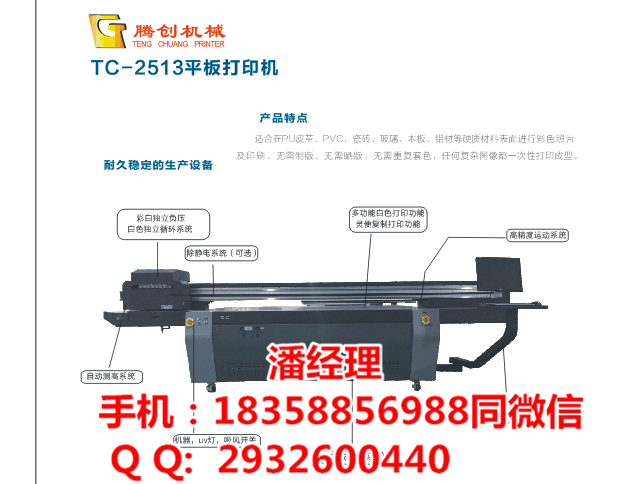 1.不选贵的,只选对的一般来讲,用户应根据工作的性质和业务实际需求选择设备类型和规格。在选购建材打印机时,首先要准确了解自己的工作特点和日常作业要求,例如应 该考虑所打印的最大幅面是多少,所打印图像的分辨率需要多高,每天的打印量 到底有多大,是否需要无人值守打印功能,以及应该采用多大容量的墨水盒等。同时要考虑设备的主要用途是以彩色图像输出为主,还是以文字 输出为主。浙江腾创的打印机,可以根据客户的实际应用产品和行业需求,进行针对性的研发和生产。