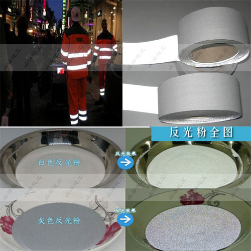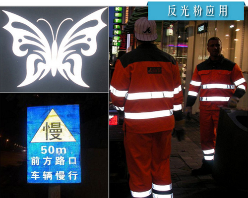 反光粉产品特性:反光材料制品采用高折射率玻璃珠后半表面镀铝作为后向反射器,具有极强的逆向回归反射性能,能将85%的光线直接反射回光源处,回归反射所造成的反光亮度,可使驾驶人员和带光源的夜间作业人员在夜间或视野不佳的情况不清楚地看见行人和障碍目标,确保双方安全。