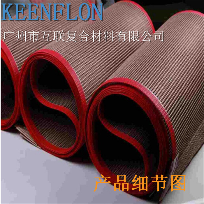 PTFE聚四氟乙烯特氟龙网格输送带是以悬浮聚四氟乙烯(俗称塑料王 杜邦特氟龙)乳液为原料,浸渍高性能玻纤网布(宏和玻纤基布)而成。是一种高性能,多用途的复合材料新产品。因其优异的各项性能,故被广泛应用在造纸、食品、环保、印染、服装、化工、玻璃、医药、电子、绝缘、砂轮切片、机械等领域。