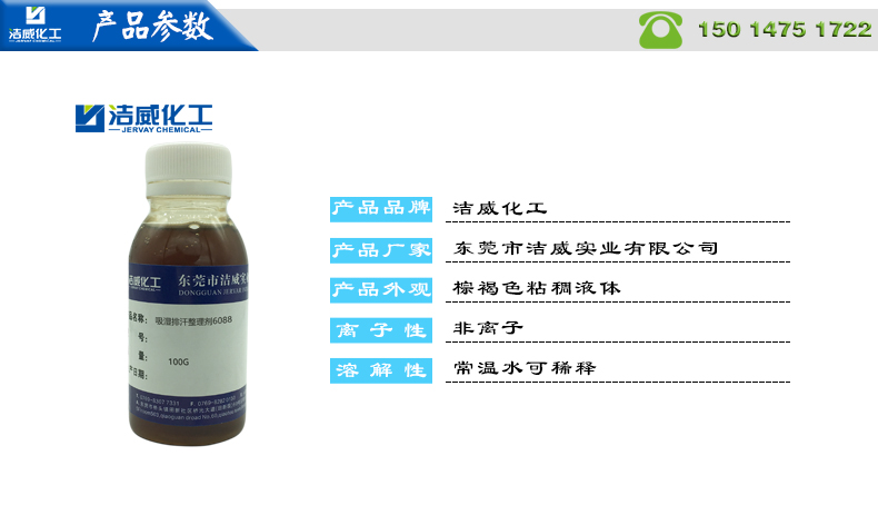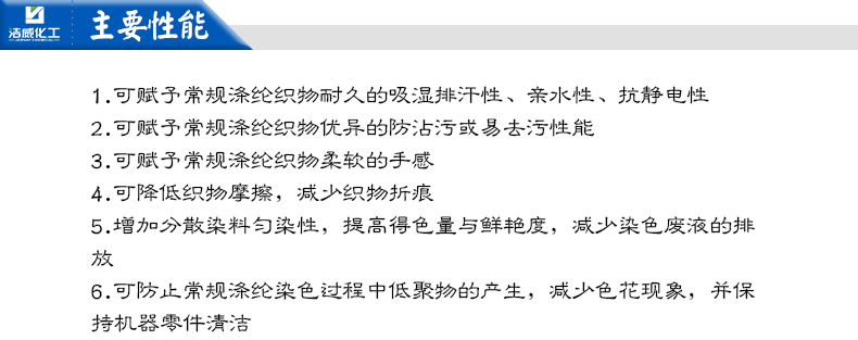 吸湿排汗整理剂6088是运用当今最先进的聚酯嵌段技术研制成的耐久型液体类多功能整理剂,与传统的聚酯整理剂相比,能赋予织物出色的耐久服用性能。吸湿排汗整理剂6088适用于常规涤纶分散染料染色和后整理工艺,能赋予织物持久的吸湿、排汗、亲水、防污、柔软、抗静电等多种功能,使常规聚酯纤维有天然纤维的一些基本特性;用于分染料染色过程中,能赃予织物较好的匀染效果,同能提高织物的得色量与鲜艳度,并能防止织物产生折痕。