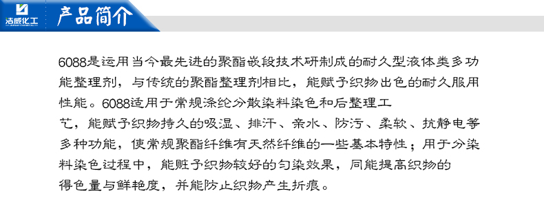 1.吸湿排汗整理剂6088可赋予常规涤纶织物耐久的吸湿排汗性、亲水性、抗静电性