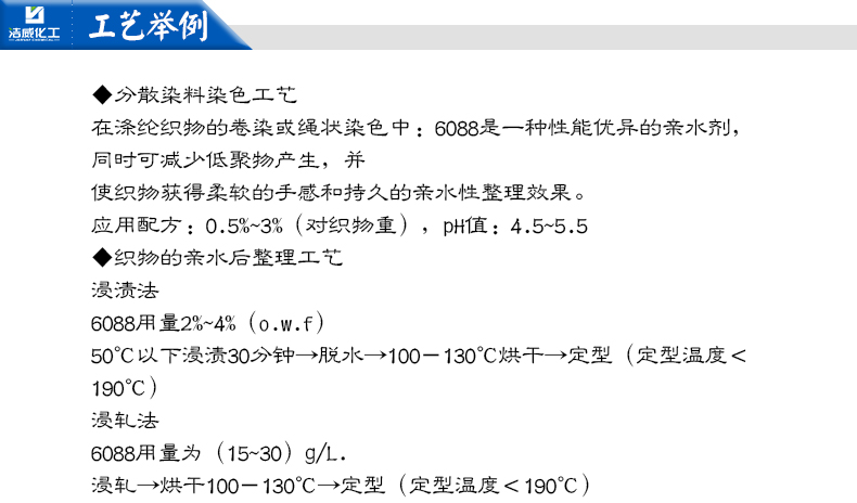 在涤纶织物的卷染或绳状染色中:吸湿排汗整理剂6088是一种性能优异的亲水剂,同时可减少低聚物产生,并