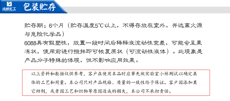 吸湿排汗整理剂6088具有假塑性,放置一段时间后稀释液流动性变差,可能会呈果冻状,使用前进行搅拌即可恢复原状(可流动性液体)。此现象是产品分子特殊的体现,但不影响应用效果。