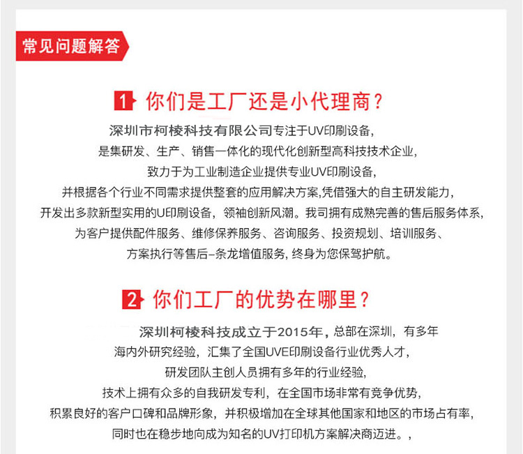 看技术其实是比较难的一点,很多人面对厂家眼花缭乱宣传的技术弄昏了头脑,有的厂家避重就轻,把无关紧要的技术说成很厉害的技术,关键技术上则一带而过。例如墨水恒温,其实是墨水不防冻,需要额外加一个保温盒保温。再例如自动跳白,实际应用中图案出现白的概率不到5%,并不实用。接下来我将为大家讲一些墙体彩绘机比较关键的技术,无需电脑、无线操作、断电续航8小时以上、双红外感应器、微曲面追踪、可拆卸机头等