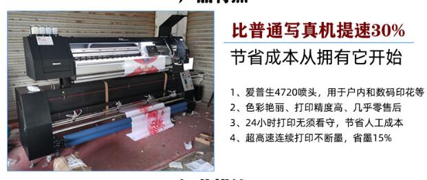 焕图3头旗帜写真机,是一款针对广告加工厂配置的写真机,也是一款超速写真机,配置3个爱普生4720高速喷头,印刷速度最高达85平方/小时,画质高清精美,并且稳定性强,胜任大批量生产需求,是广告加工厂最合适的广告设备。
